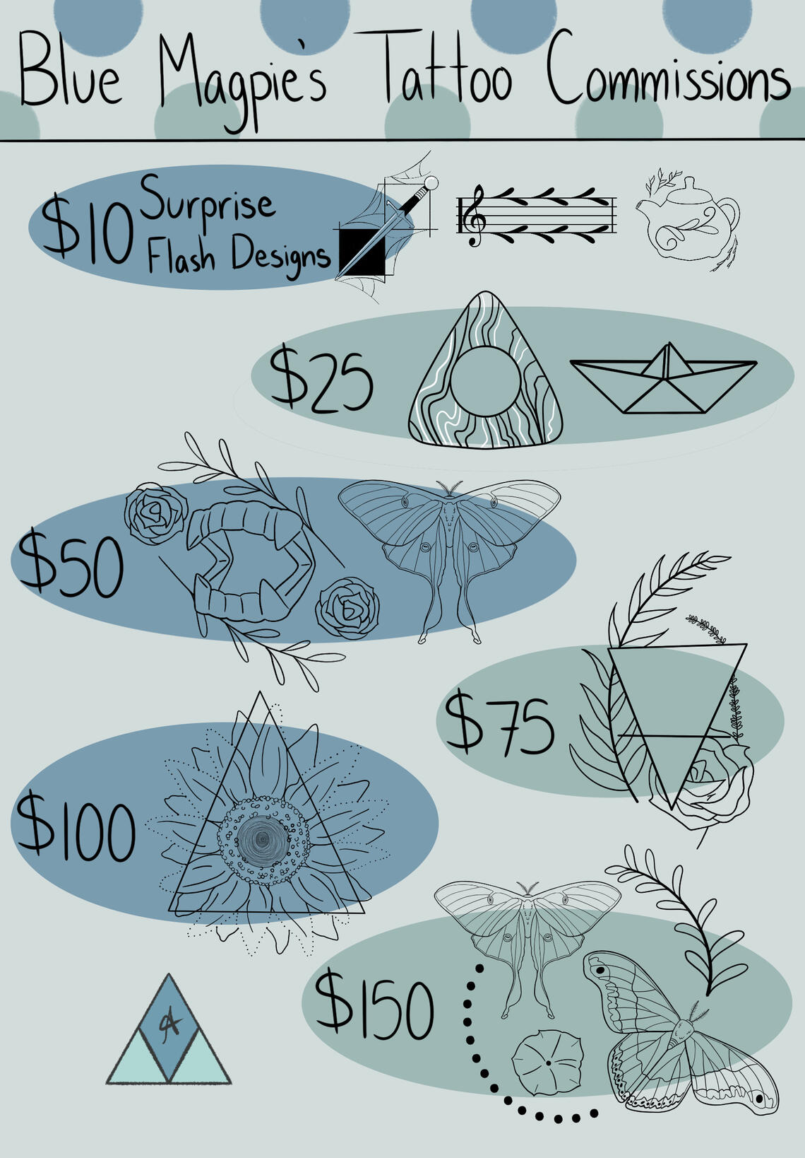 Hello, my name is Magpie, you can also call me Moth (they/it pronouns)! I'm a 28 year old physically disabled artist who specializes in tattoo designs, floral drawings, and silly oc art.Thank you for showing an interest in my commissions and art! On this site you'll find my TOS, commission prices, art examples, my queue, my ko-fi, and everywhere you can contact me! For non-tattoo commissions you can visit my other carrd here: carrd